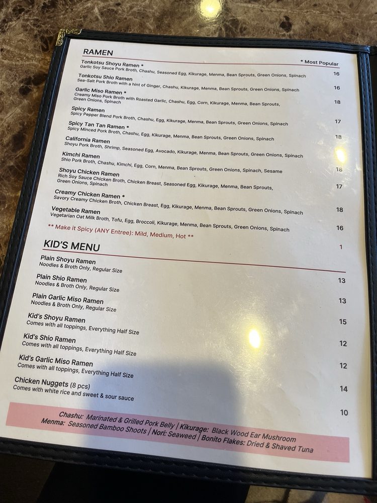 Spicy Pepper Blend Pork Broth, Chashu, Egg, Kikurage, Menma, Bean Sprouts, Green Onions, Spinach